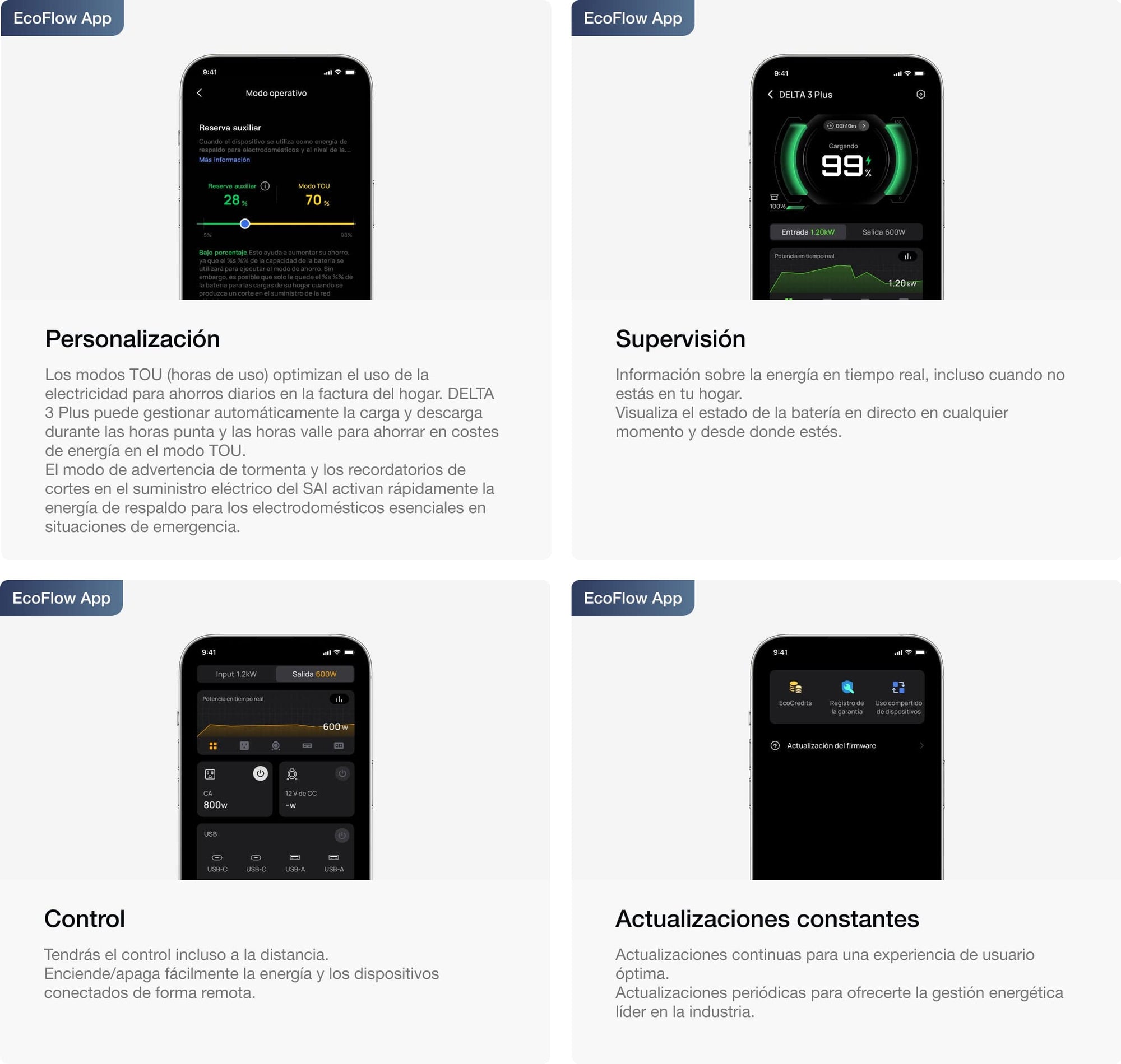 Estoy muy contento con mi EcoFlow Delta 3 Plus. Lo que más valoro son sus dos entradas solares independientes y la aplicación EcoFlow, que es completa y muy fácil de usar. Puedo controlar todo desde el móvil en tiempo real. Sin duda, una compra acertada.