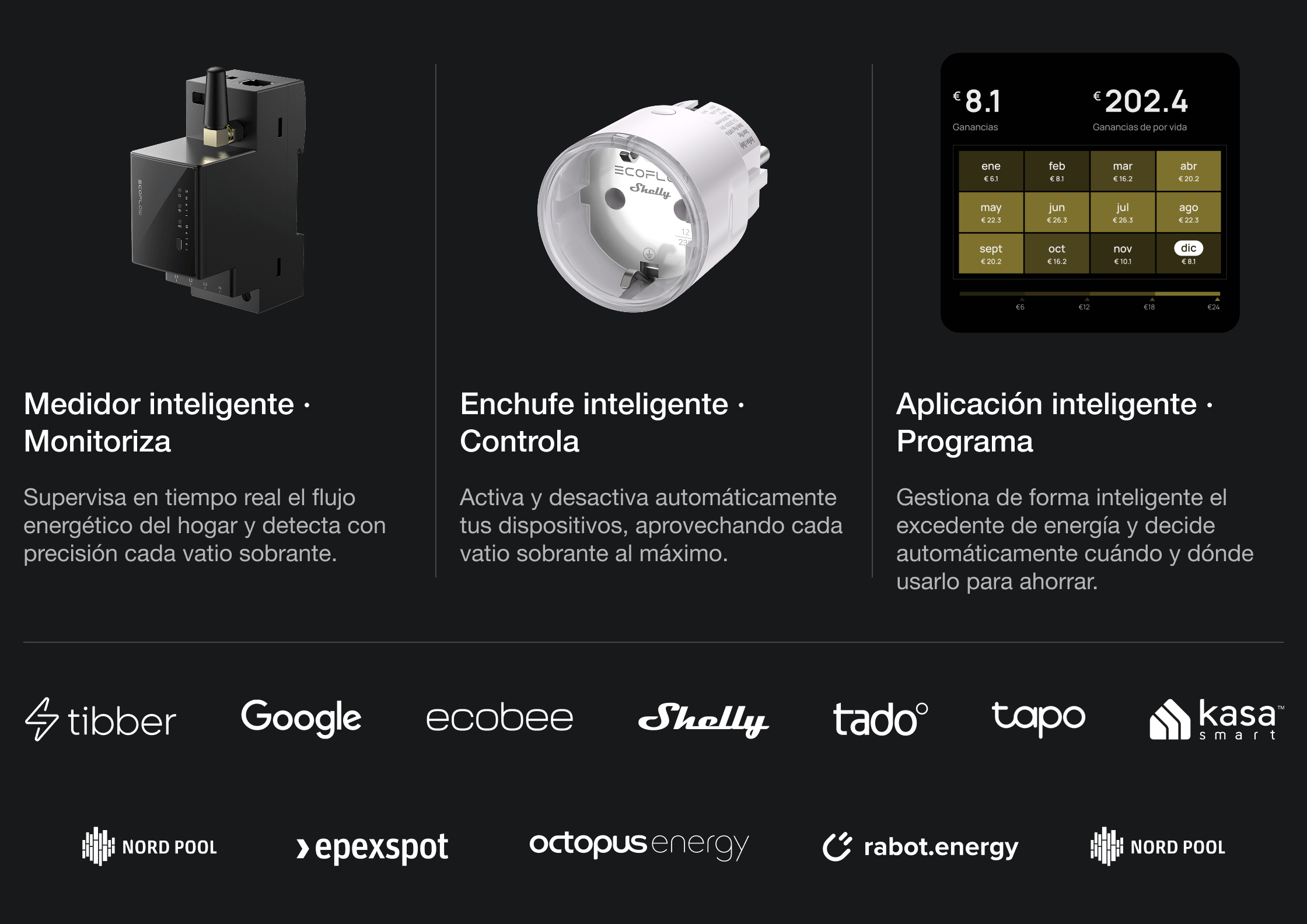 EcoFlow trabaja con marcas líderes en energía inteligente como Shelly, Tibber y otras, gestionando la energía de tu hogar con el Medidor inteligente, los Enchufes inteligentes y la Aplicación EcoFlow. Haz que tu aspersor, bici eléctrica o ventilación se activen automáticamente con el excedente solar. Aprovecha cada rayo de sol solo para ti.
