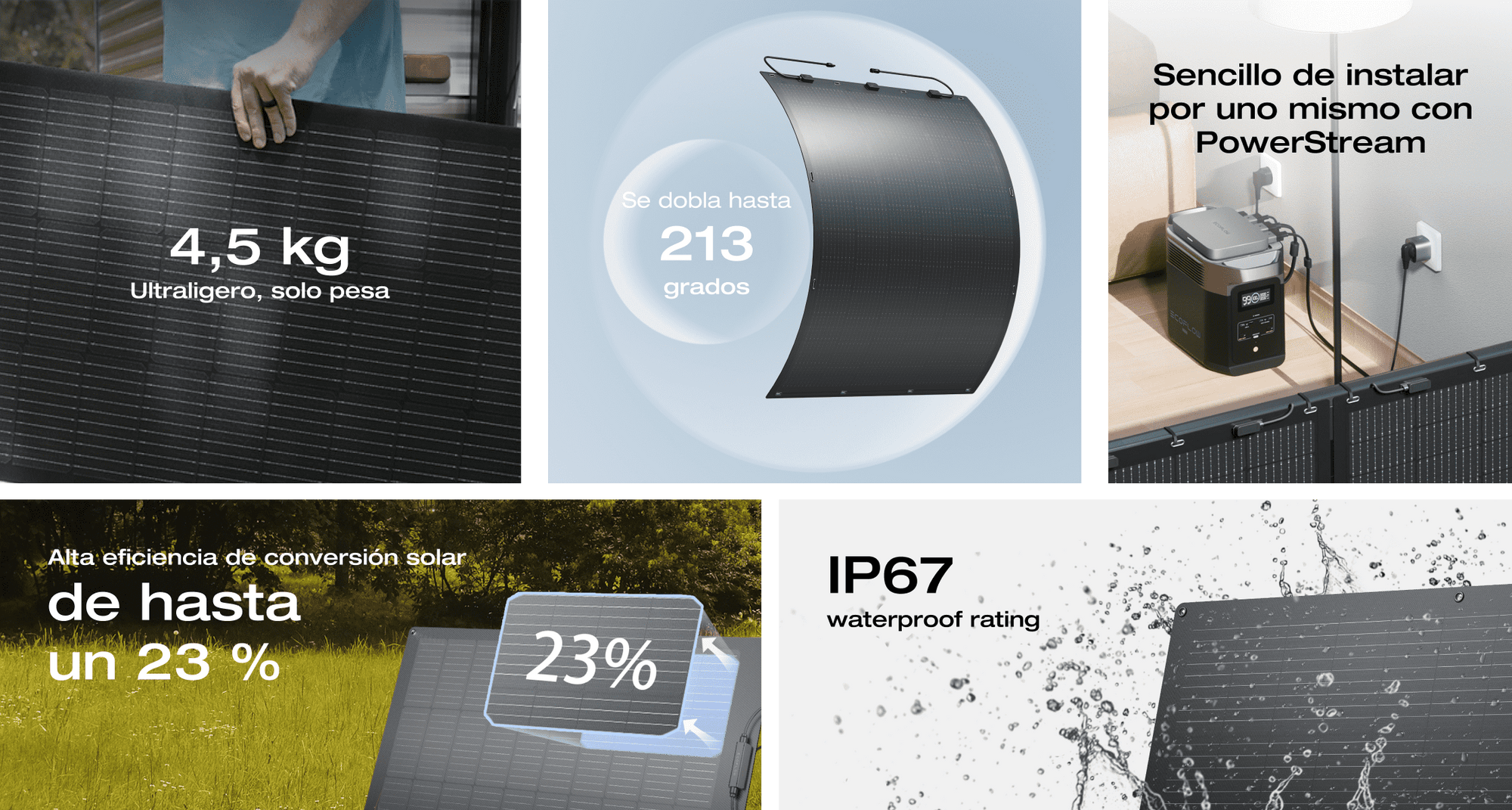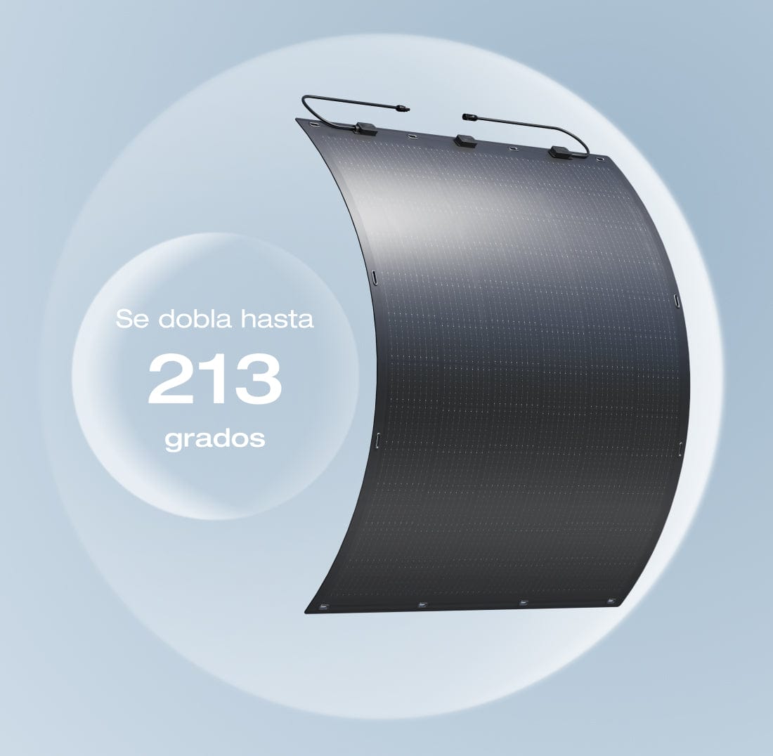 Excepcionalmente ligero y un 70 % menos pesado que los paneles solares tradicionales, por lo que es muy cómodo de transportar y montar. Se dobla fácilmente hasta 213 grados y se adapta a la forma única de tu balcón sin que ello afecte a la entrada solar.
