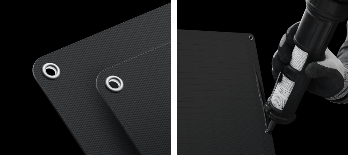 Los orificios precortados permiten colgar el panel solar flexible con ganchos o fijarlo de forma segura a una superficie con un adhesivo para que quede perfectamente instalado y estable en tu balcón.