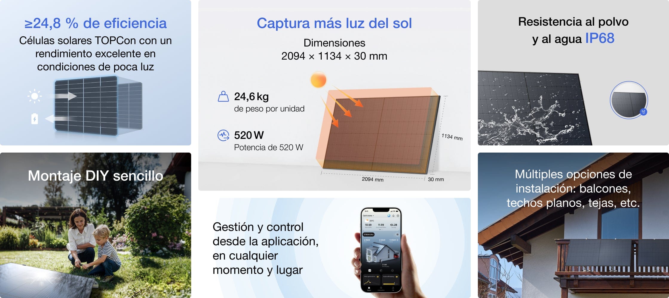 Con una eficiencia del 24,8 %, el Panel solar EcoFlow de 520 W se posiciona entre los más eficientes de su categoría. Gracias a su diseño bifacial, es capaz de capturar luz procedente de ambos lados y maximizar de esta forma la producción de energía.