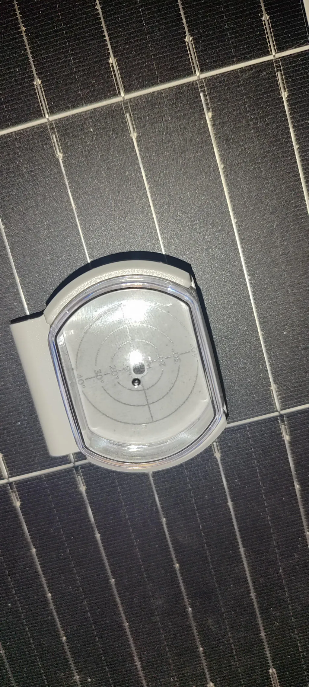 3. Una vez que el sol brille a través de la cubierta transparente, ajusta el ángulo del panel solar hasta que la sombra se coloque en el centro de la guía.