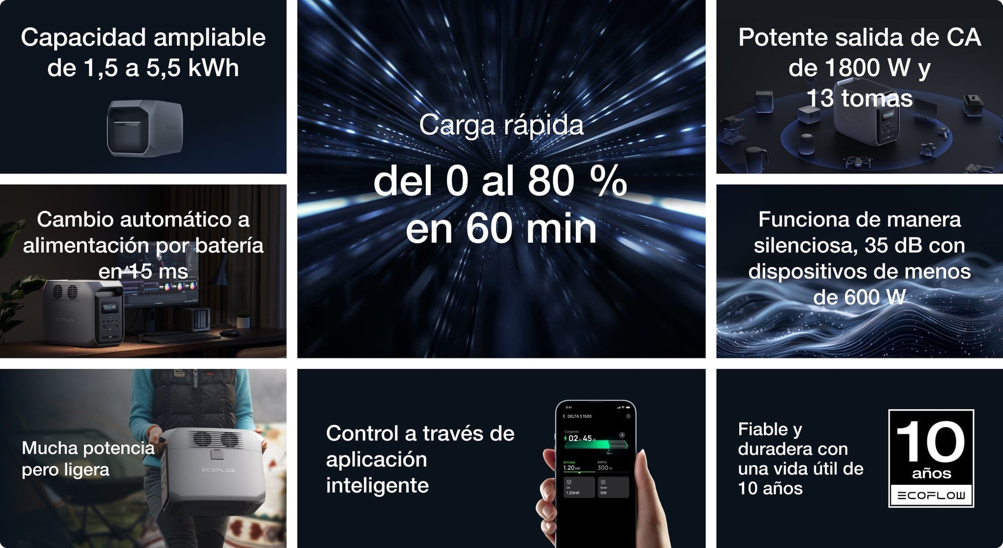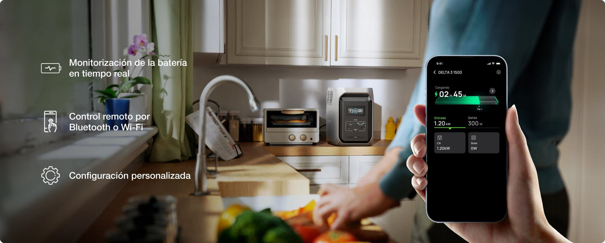 DELTA 3 (1500) ofrece una gran capacidad de batería de 1500 Wh, ampliable hasta 5500 Wh. Mantén tus electrodomésticos en funcionamiento; para uso diario o como energía de respaldo para el hogar. Es energía flexible y bajo demanda.