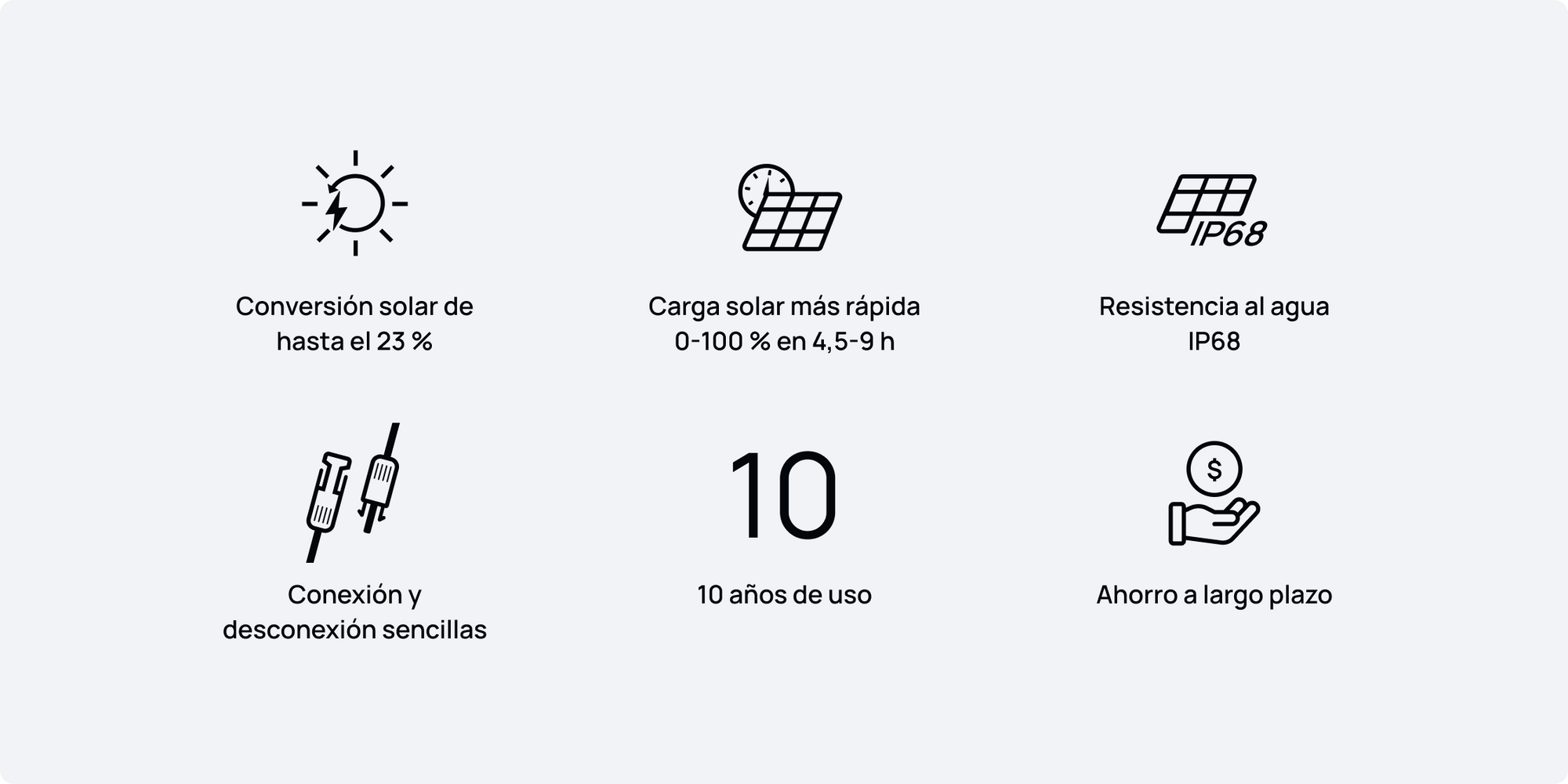 • Proporciona hasta 1,8kWh al día con carga solar.