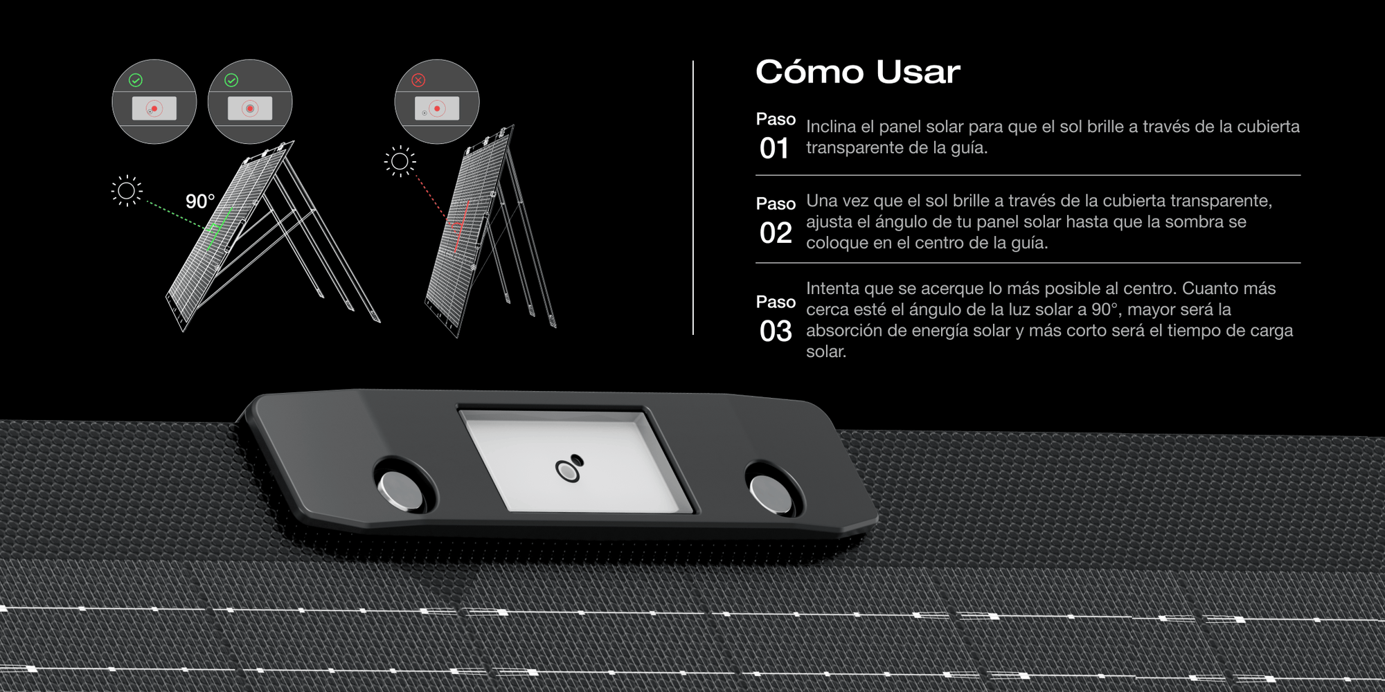 Mantén la luz solar en un ángulo de 90° y concentra los rayos del sol en la superficie del panel solar para aprovechar al máximo la luz en todo momento.