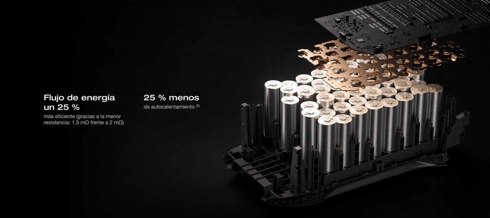 6. Se refiere a la resistencia interna de las celdas LFP de pestaña completa de EF, que es de 1,5 mΩ, un 25 % menor que la resistencia interna de 2 mΩ de las celdas de la batería EF #C33 anteriores.
