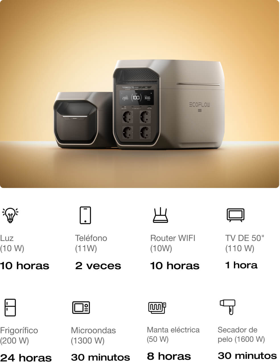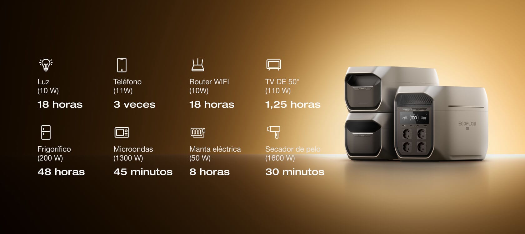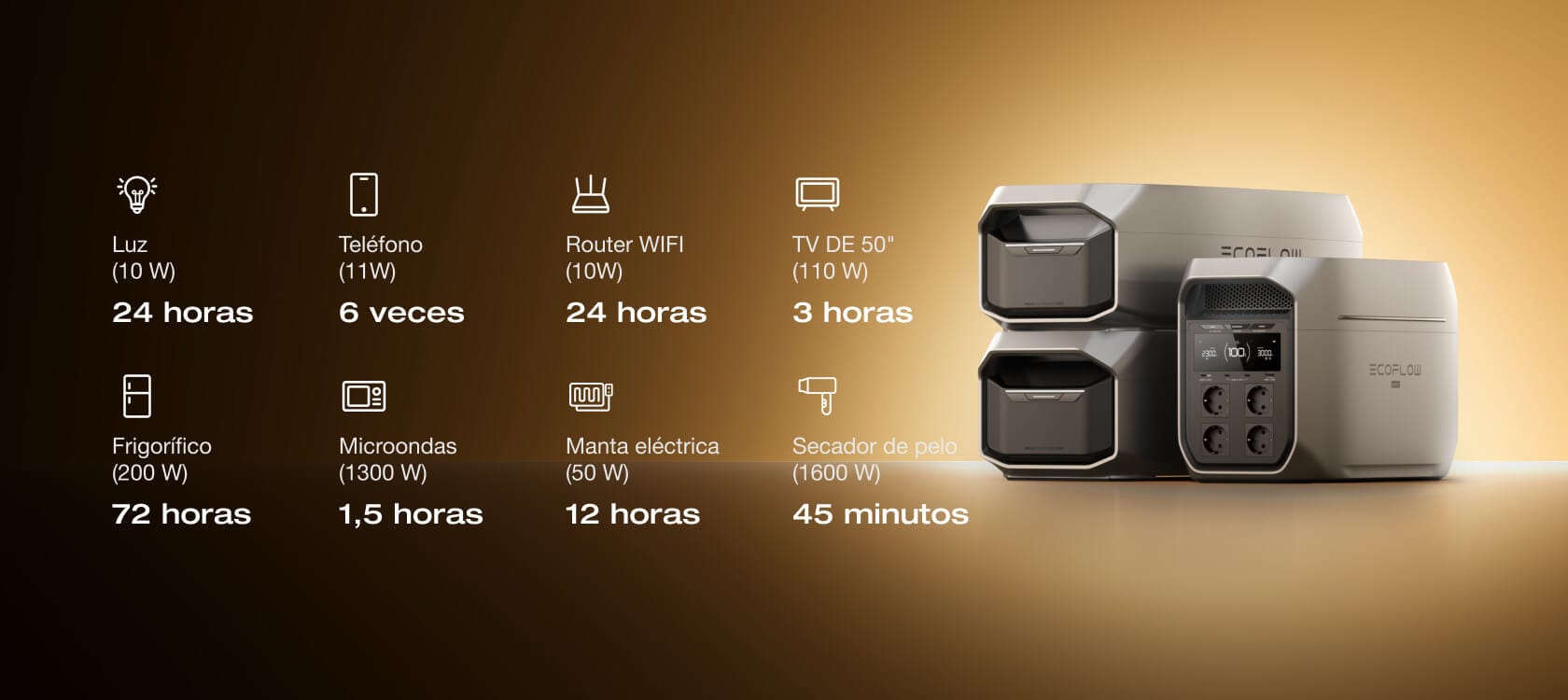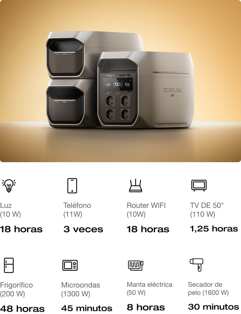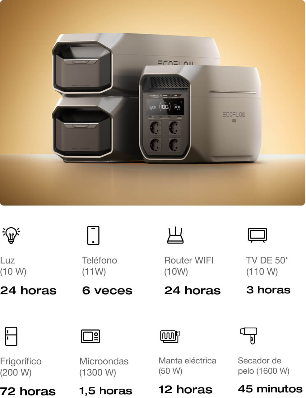 17. Se requiere la conexión de 1 × DELTA 3 Max Plus + 2 × baterías adicionales inteligentes DELTA Pro 3 con adaptador de expansión para batería adicional inteligente EcoFlow. El adaptador de expansión se lanzará pronto.