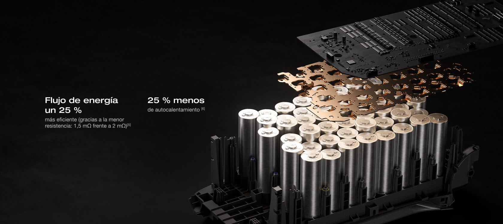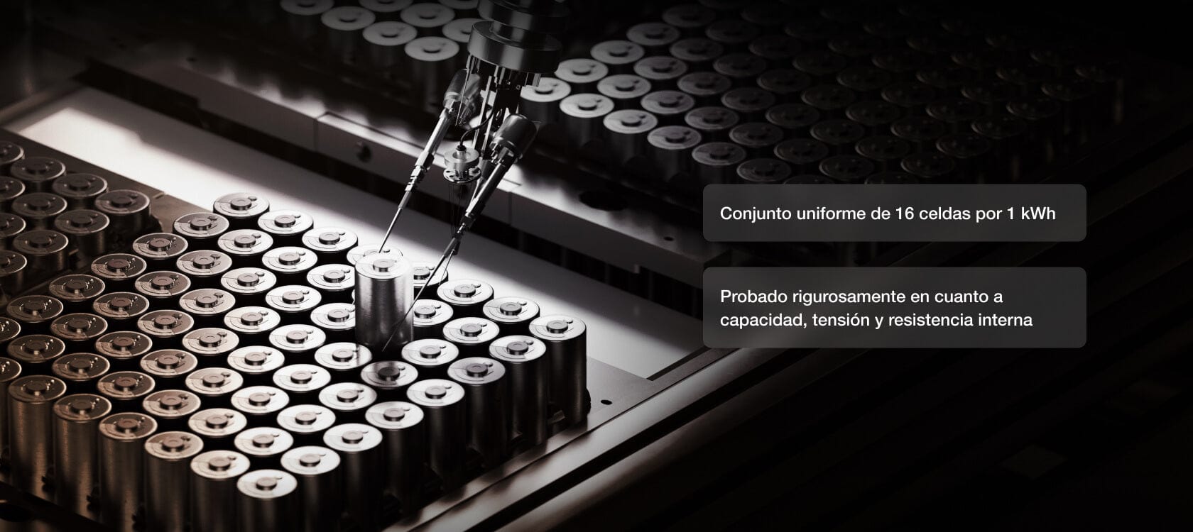 Con un 27 % menos de celdas por kWh, [7] nuestro diseño de 16 celdas funciona más frío, dura más tiempo y ofrece mayor estabilidad. Cada celda se prueba rigurosamente en cuanto a capacidad, tensión y resistencia interna, lo que da como resultado un paquete altamente uniforme que protege contra sobrecarga, desequilibrio y desgaste prematuro.