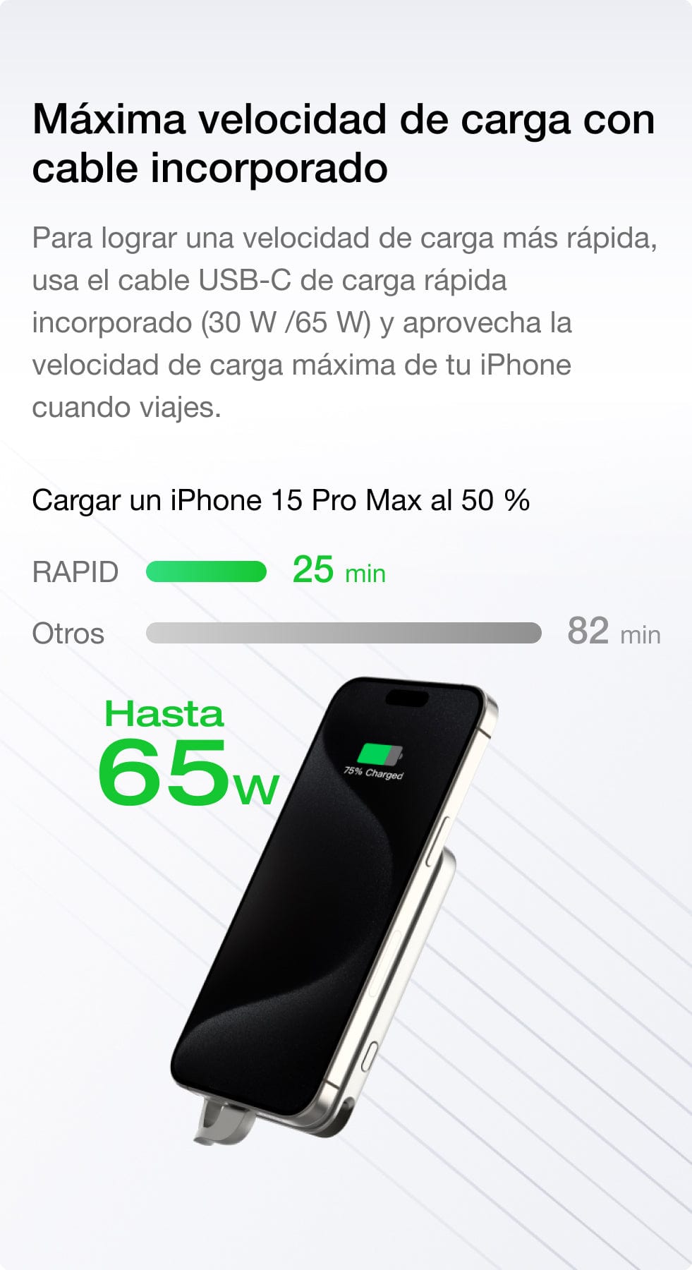 RAPID utiliza la tecnología patentada X-Stream para lograr una densidad energética de nivel de teléfono inteligente y una capacidad de carga rápida. Además, funciona con el protocolo PD3.0 para posibilitar la carga y recarga flash. Provista con carga inalámbrica con certificación Qi2 y un diseño de cable incorporado, cargar con RAPID es sinónimo de comodidad a unas velocidades de carga máximas.