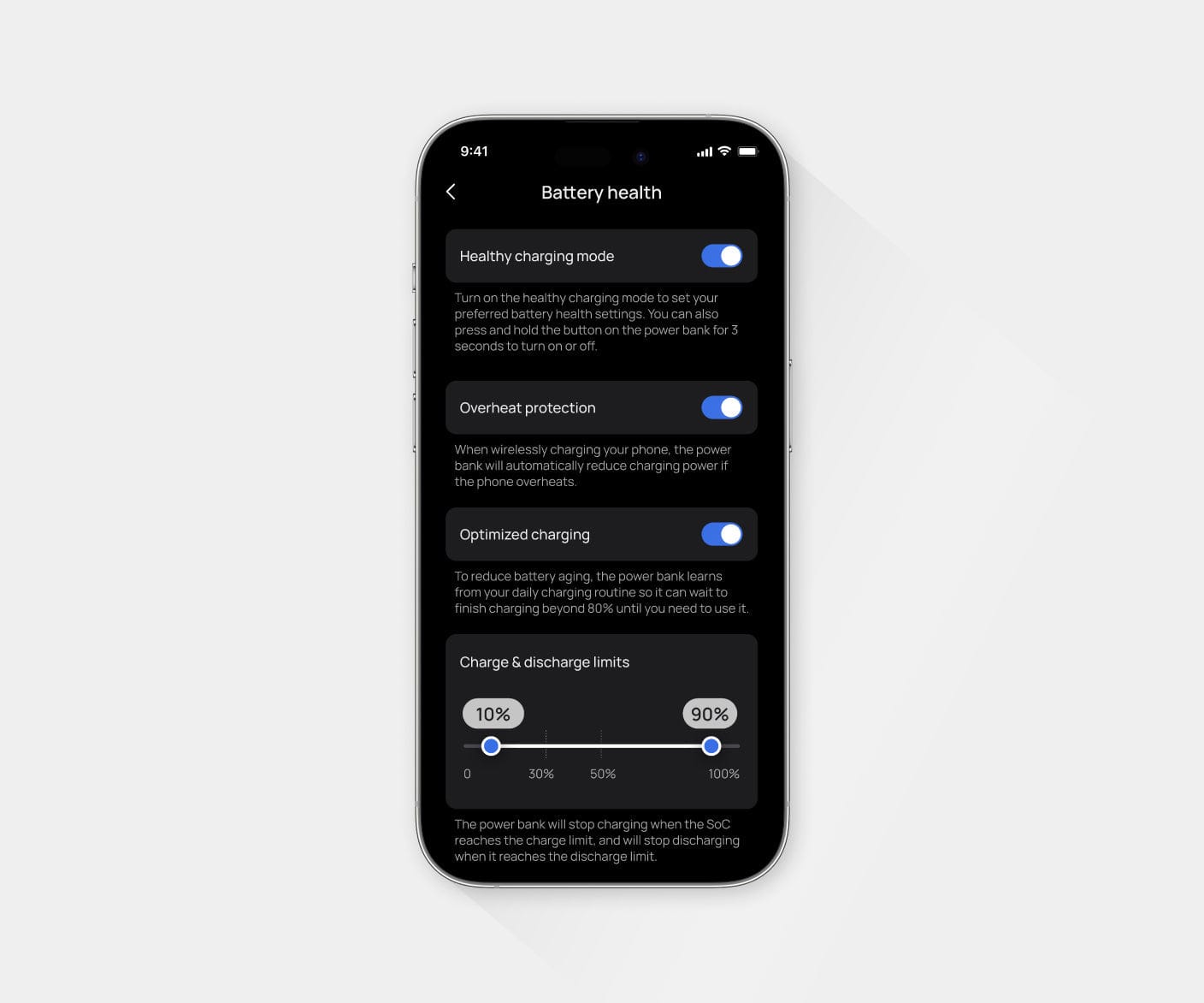 RAPID incluye un sistema de gestión de la energía que ayuda a que la batería tenga una buena salud. Activa el «Modo de carga saludable» en la aplicación para disfrutar de una mayor duración de la batería