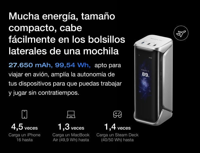 Sí, según las regulaciones de la Organización de Aviación Civil Internacional (OACI) y de la mayoría de las aerolíneas, está permitido llevar en el avión un banco de energía con una capacidad inferior a 100 Wh. El RAPID Pro, con una capacidad de 27 650 mAh (99,54 Wh), cumple con este requisito y, por lo tanto, puede llevarlo a bordo sin problema.