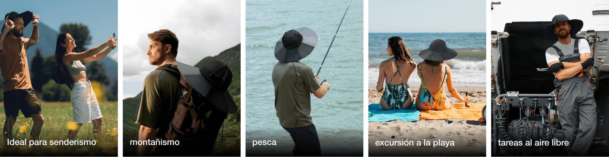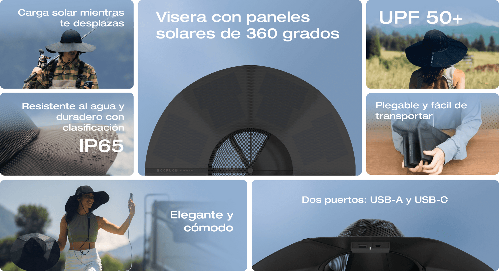 Ideal para senderismo, montañismo, pesca, salidas a la playa, tareas al aire libre y muchas más situaciones. Perfecto para cargar energía solar durante una actividad al aire libre y al mismo tiempo disponer de protección contra el sol.