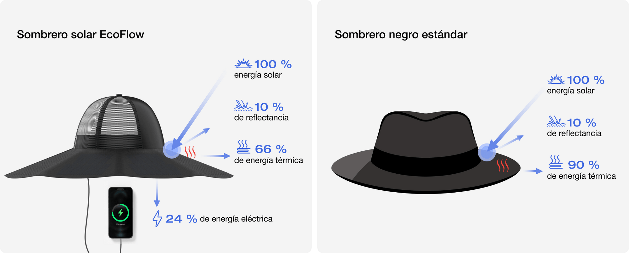 Durante el proceso de carga, los paneles solares del ala del sombrero convierten el 24 % de la energía solar absorbida en electricidad, y la energía convertida en calor se reduce al 66 %. En comparación con un sombrero negro estándar, tiene una temperatura de superficie más baja, por lo que llevarlo es una experiencia más fresca.